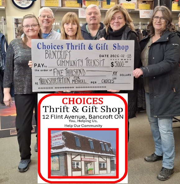 Choices announced their donation of $5,000 to BCT on their Facebook page on Feb. 18. In addition to this donation, they have also donated recently to Hospice North Hastings ($600), North Hastings Public Library ($1,600 for the large print book program), Bancroft Family Health Team ($4,511.82 for their diabetes program), and Hastings Centennial Manor ($14,575.87 for towel and blanket warmers). Overall, over $26,000 donated to these five organizations. They donated to BCT to help support local medical transportation, and they thanked their hardworking volunteers who made it possible and to everyone who shops and donates, saying that their support stays right here in town, and thanking everyone for helping them support such a vital local service like BCT.
